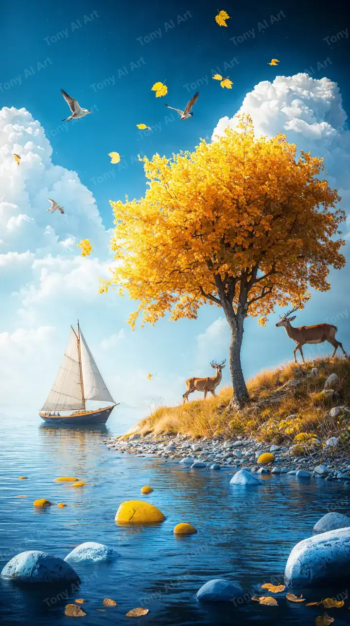 Hình nền AI art cây vàng mùa thu, nai nước, thuyền buồm trên hồ xanh, hiệu ứng ánh sáng mềm mại, tải miễn phí 4K.