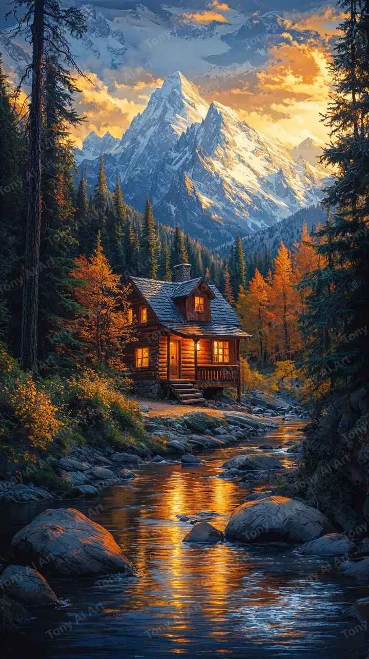 Hình nền nhà rừng hoàng hôn với núi cao, dòng suối phản chiếu ánh sáng vàng, tải miễn phí 4K từ Tony AI Art.