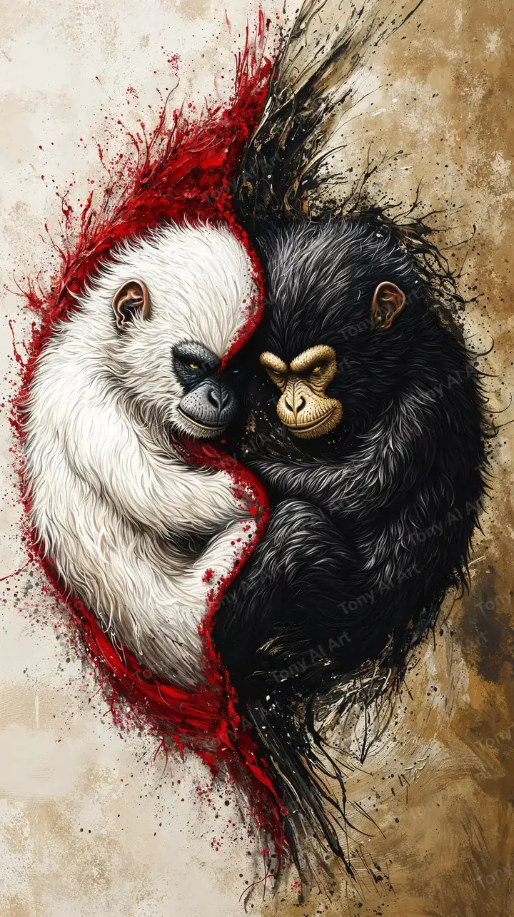 Hình nền khỉ tâm linh hiệu ứng splatter paint, đối xứng sáng tối, graffiti art AI, tải miễn phí 4K HD.