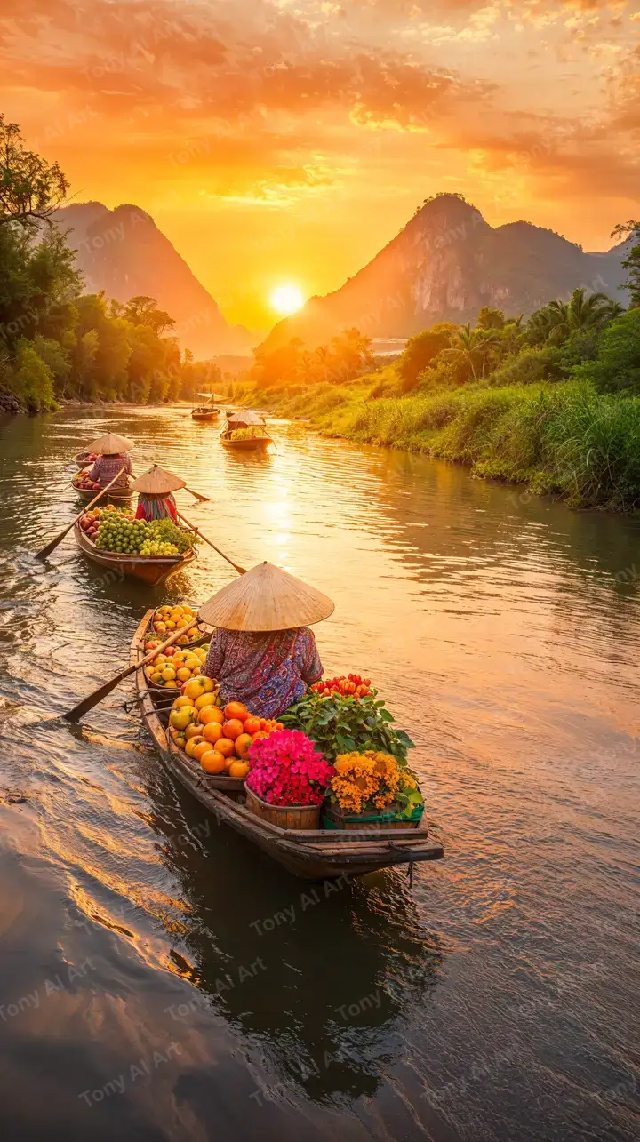 Hình nền chợ nổi Việt Nam AI art với thuyền hoa sen, mặt trời vàng kim, núi đôi hùng vĩ, tải miễn phí 4K.