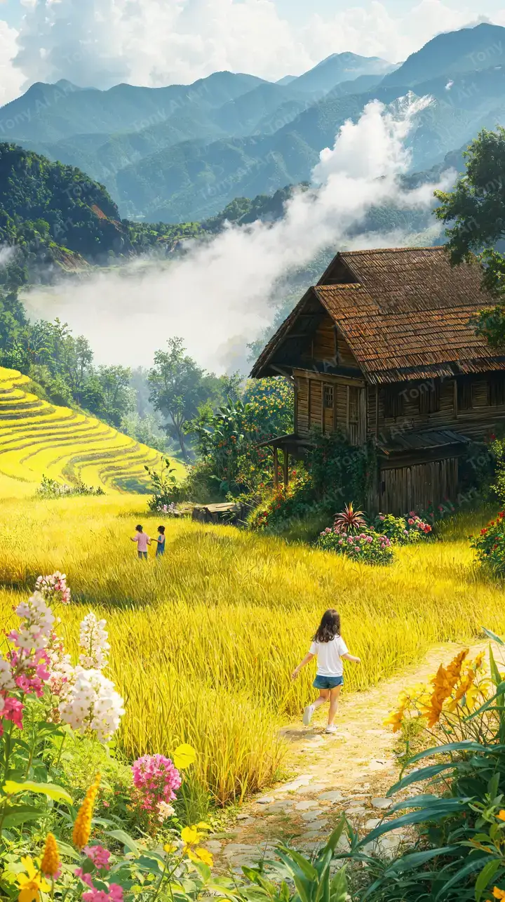 Hình nền AI art Việt Nam: cánh đồng lúa vàng, cô gái áo dài, nhà gỗ quê tính, núi sương mù. Phong cảnh yên bình, tải miễn phí 4K HD.