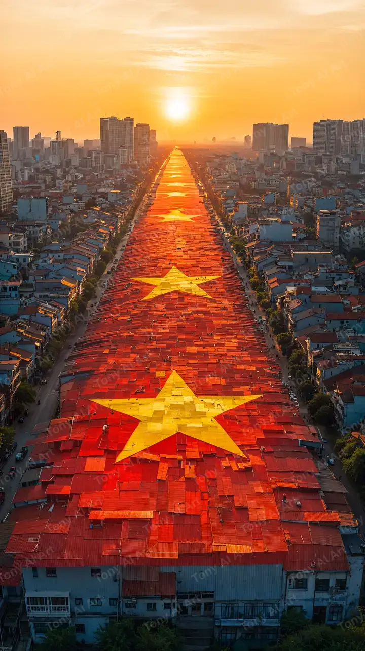 Hình nền cờ Việt Nam AI art, thành phố dưới hoàng hôn, hiệu ứng mosaic retro, tải miễn phí 4K.