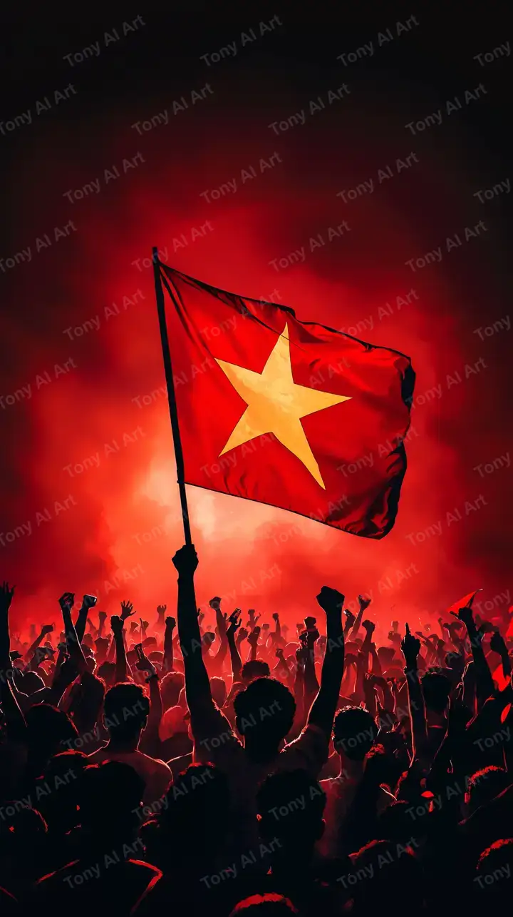 Hình nền lá cờ Việt Nam AI art, đám đông tự hào với hiệu ứng glow neon rực rỡ, tải miễn phí 4K.