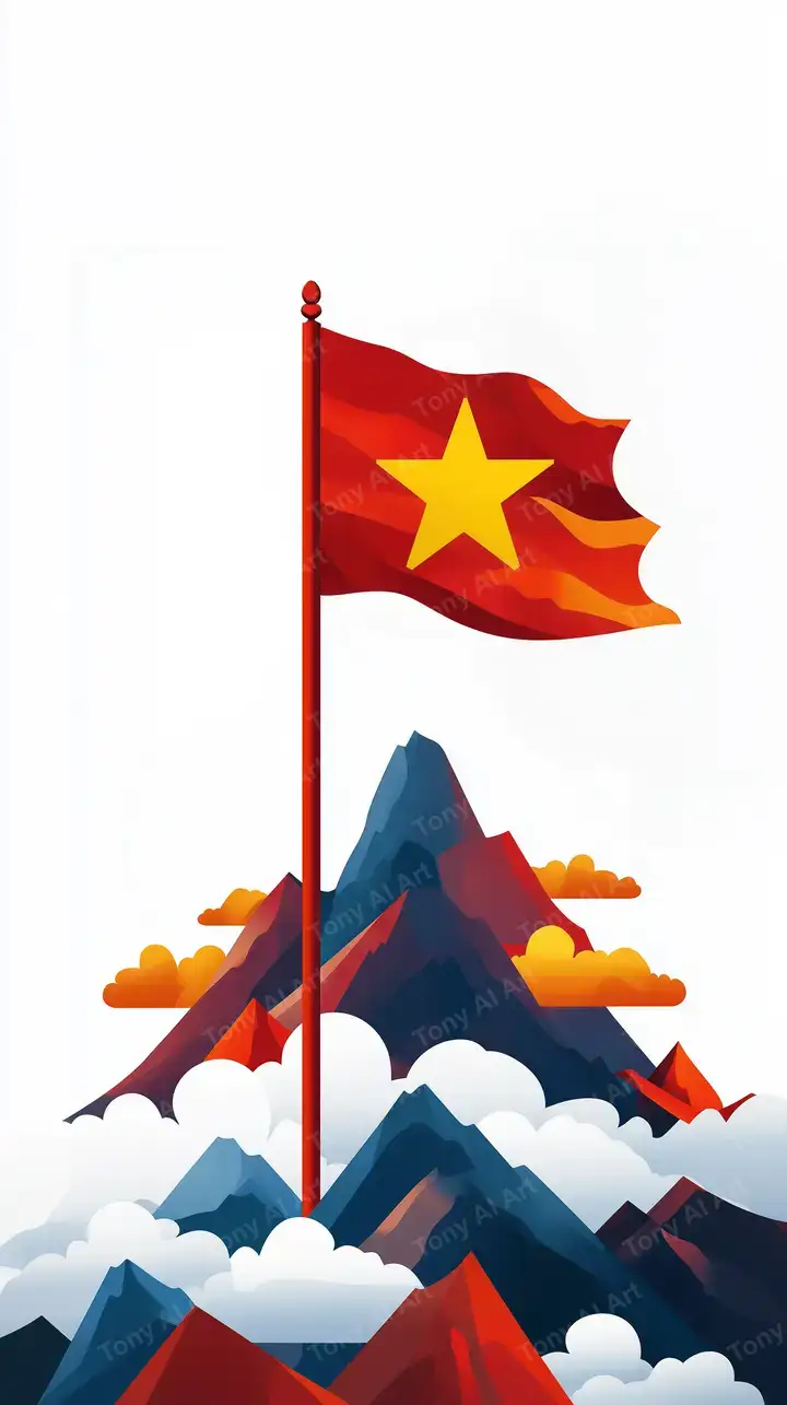 Hình nền cờ Việt Nam trên núi AI art, gradient đỏ xanh cam, hiệu ứng minimalist, cảm hứng yêu nước, tải miễn phí 4K.