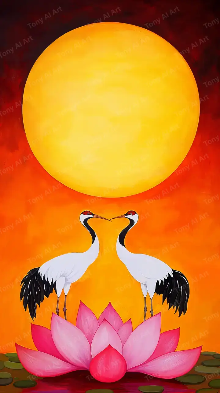 Hình nền AI art hạc vàng bên hoa sen, nền hoàng hôn gradient, phong thủy cổ điển, tải 4K miễn phí.
