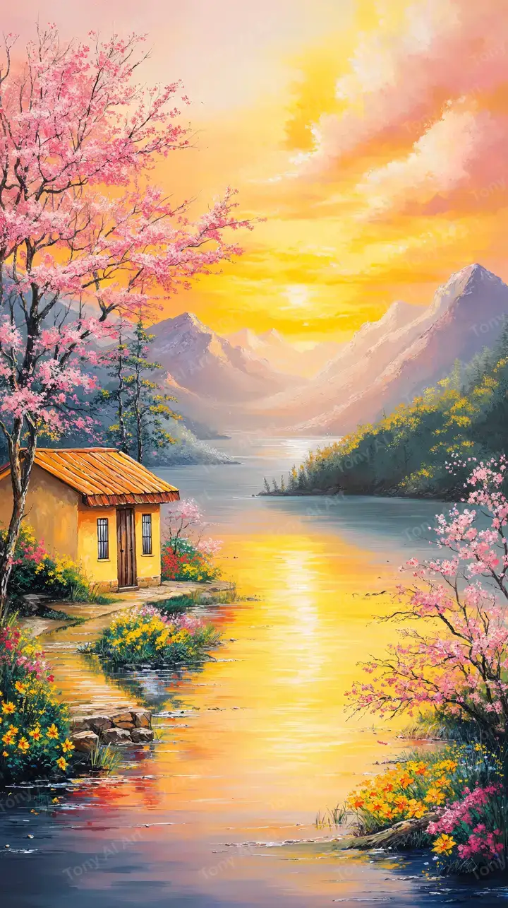 Hình nền AI art phong cảnh hoàng hôn tuyệt đẹp, cabin bên hồ nước, hoa đào hồng, hiệu ứng golden light, tải miễn phí 4K.