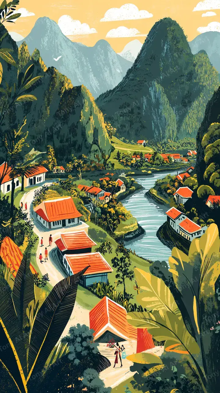 Hình nền làng quê Việt Nam với nhà mái đỏ, sông nước, núi non. AI art style vintage illustration, tải miễn phí 4K đẹp lung linh.