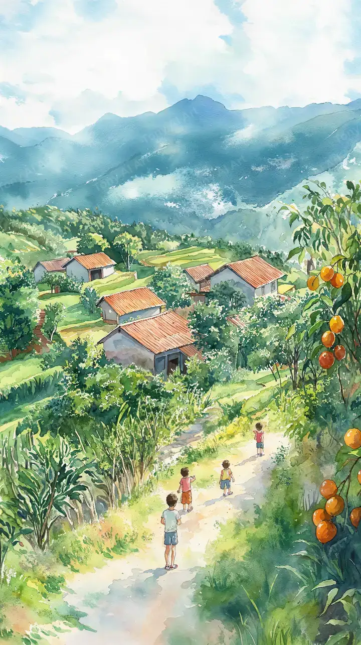Hình nền tranh AI art làng quê Việt Nam, phong cảnh núi xanh với nhà quê, hiệu ứng watercolor mềm mại, tải miễn phí 4K.