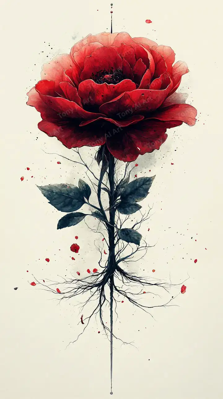 Hình nền hoa hồng đỏ phong cách watercolor với gốc rễ, hiệu ứng mực dính, nền tối giản. Tải miễn phí 4K cho máy tính.