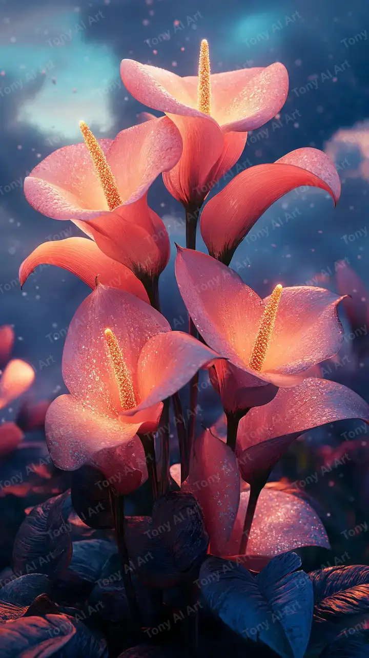 Hình nền hoa calla lily neon cosmic AI art, hiệu ứng ánh sáng fantasy kỳ diệu, tải miễn phí 4K.