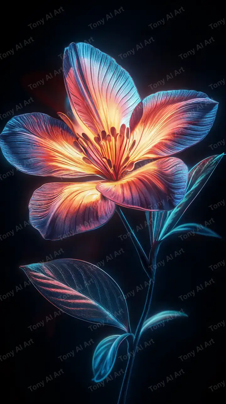 Hình nền hoa neon AI art với hiệu ứng cosmic glow, gradient xanh-vàng-hồng, download miễn phí 4K.