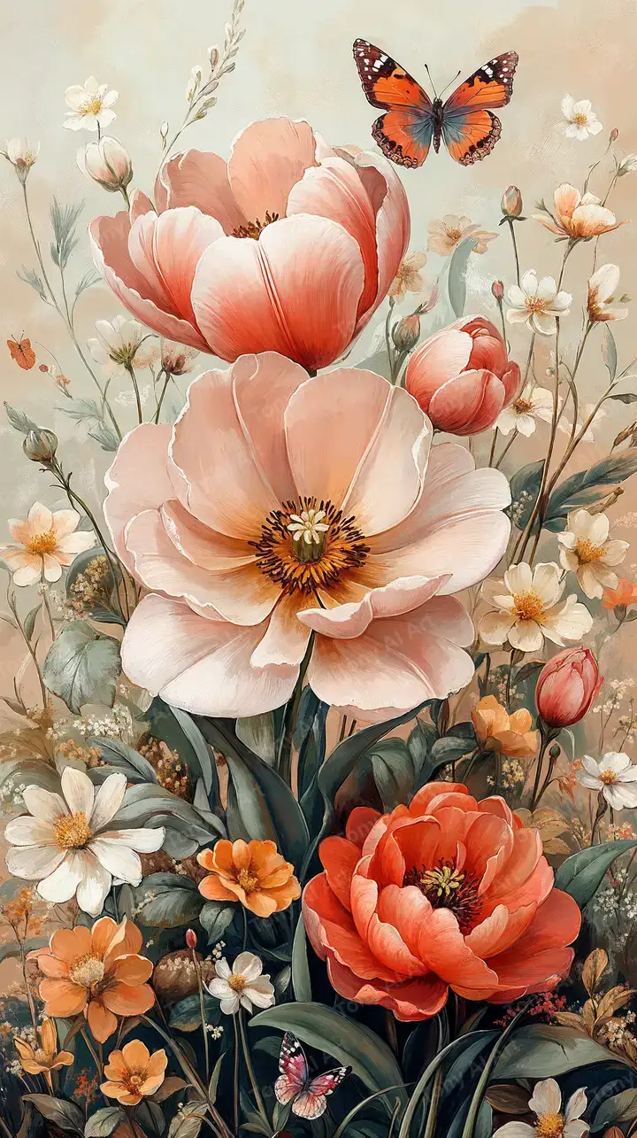 Hình nền hoa mẫu đơn hồng san hô, bướm, phong cách botanical watercolor AI art, hiệu ứng vintage retro, tải miễn phí 4K.