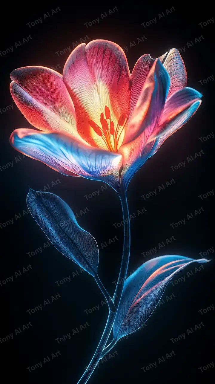 Hình nền hoa tulip neon glow AI art, gradient hồng-vàng-xanh cosmic, hiệu ứng luminous sáng, tải miễn phí 4K.