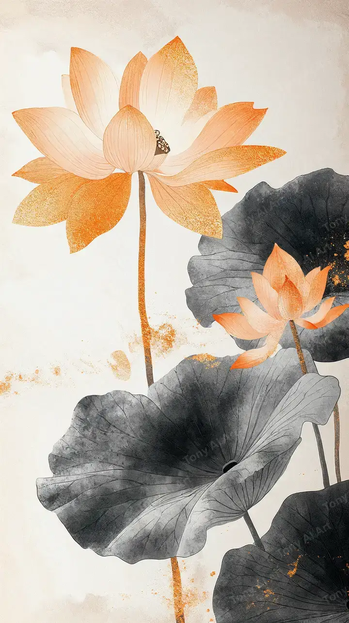 Hình nền hoa sen watercolor phong cách tối giản với lá xám, AI art vintage 4K, không copyright, tải miễn phí.