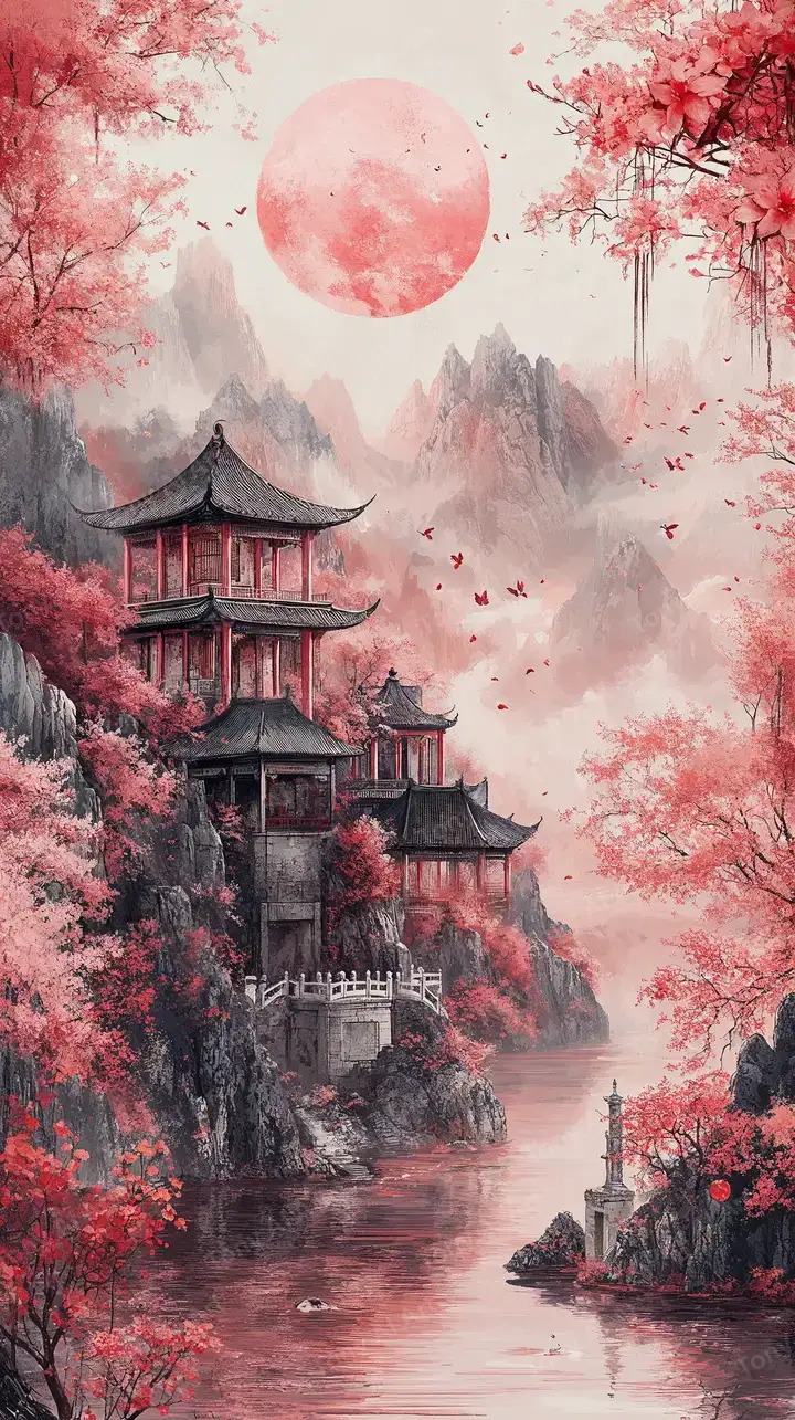 Hình nền chùa tháp hoa anh đào AI art 4K, phong cảnh Á Đông lãng mạn với sương mù, tải miễn phí.