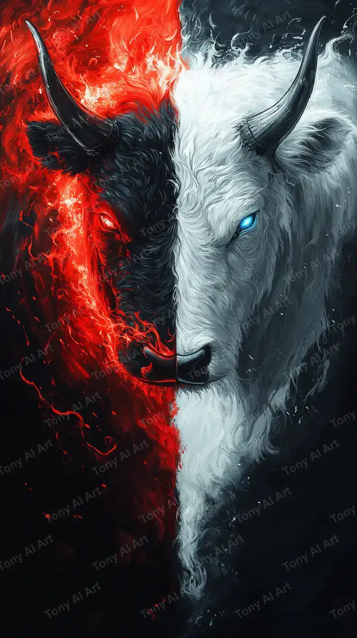 Hình nền AI art trâu lửa cosmic, cân bằng âm dương với hiệu ứng neon plasma và quang hào rực sáng.
