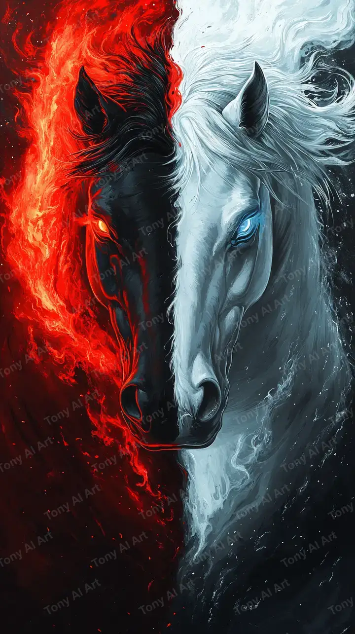 Hình nền ngựa lửa nước đối lập, phong thủy âm dương, hiệu ứng cosmic, tải miễn phí 4K.