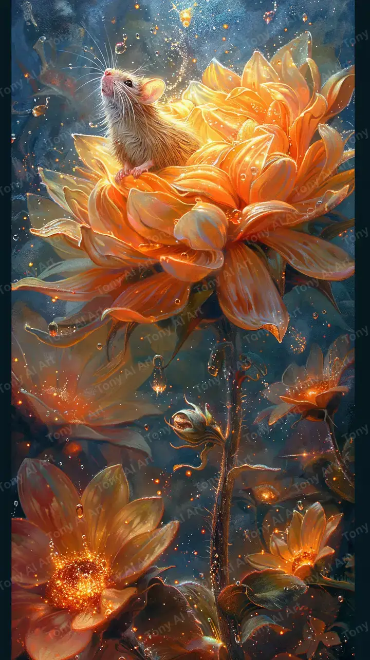 Hình nền AI art con chuột vàng với hoa neon cosmic, hiệu ứng sparkles lửa, tải miễn phí 4K UHD.