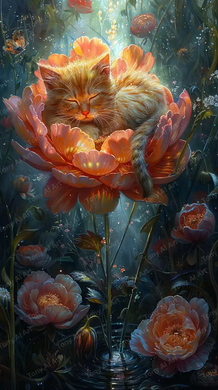 Hình nền AI art mèo trong vườn hoa cam rực rỡ, hiệu ứng neon lãng mạn, tải miễn phí 4K HD.