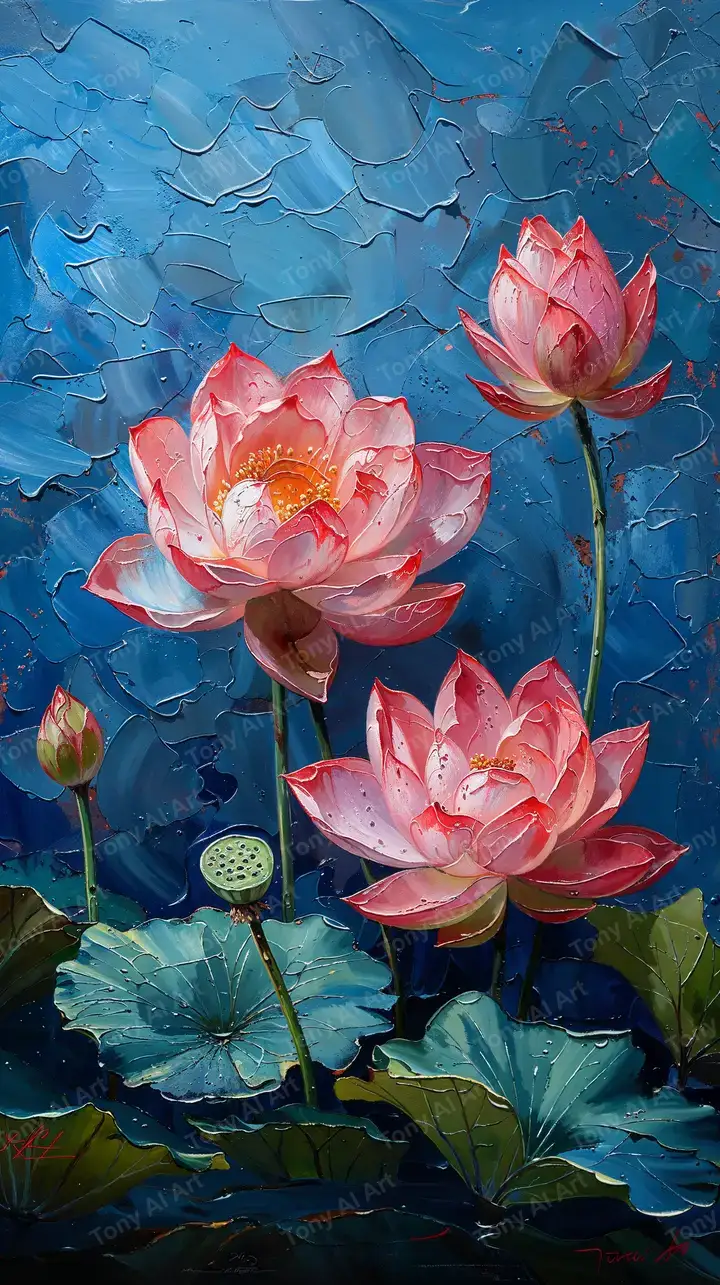 Hình nền AI art hoa sen hồng, nền nước xanh dương tâm linh, phong cách tranh sơn dầu Impressionist, tải miễn phí 4K.