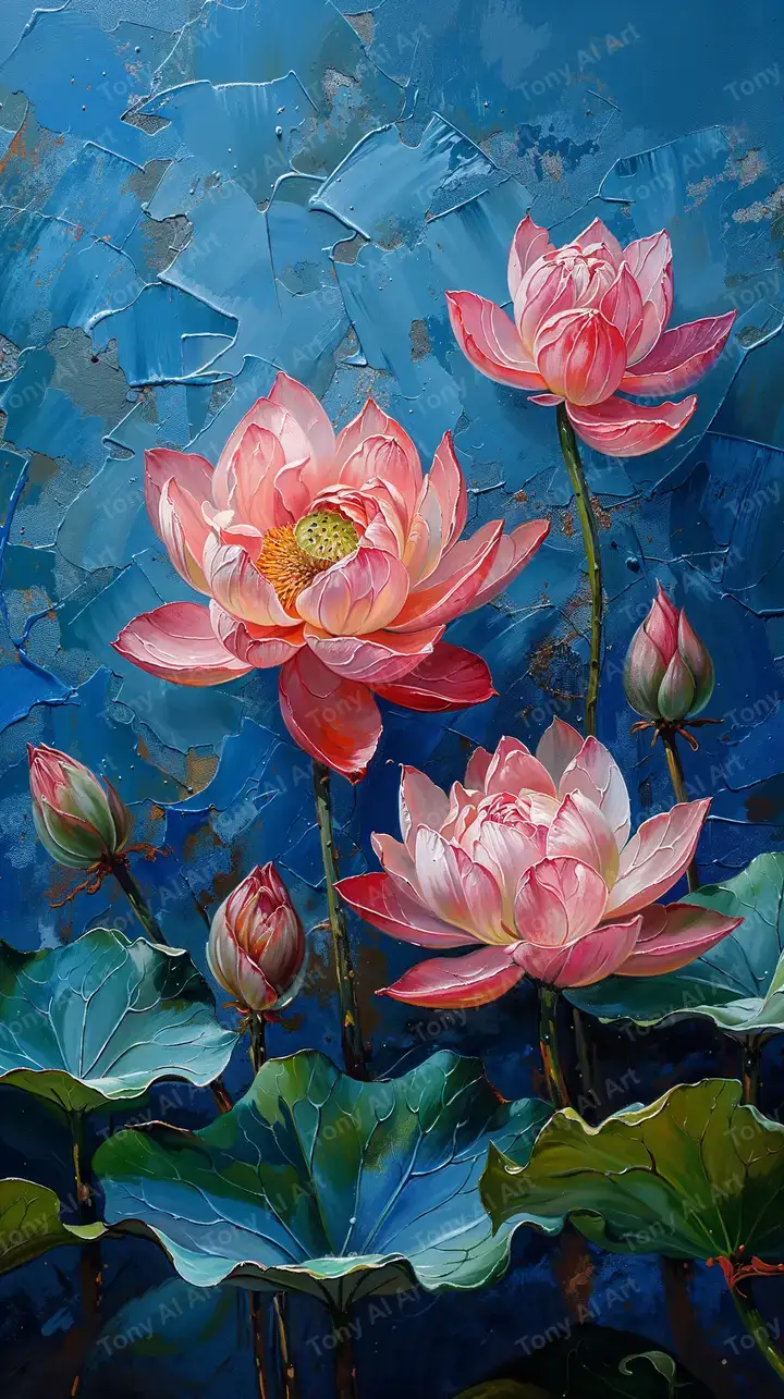 Hình nền hoa sen hồng AI art 4K phong cảnh ao nước xanh dương, hiệu ứng sơn dầu, tải miễn phí đẹp lung linh.