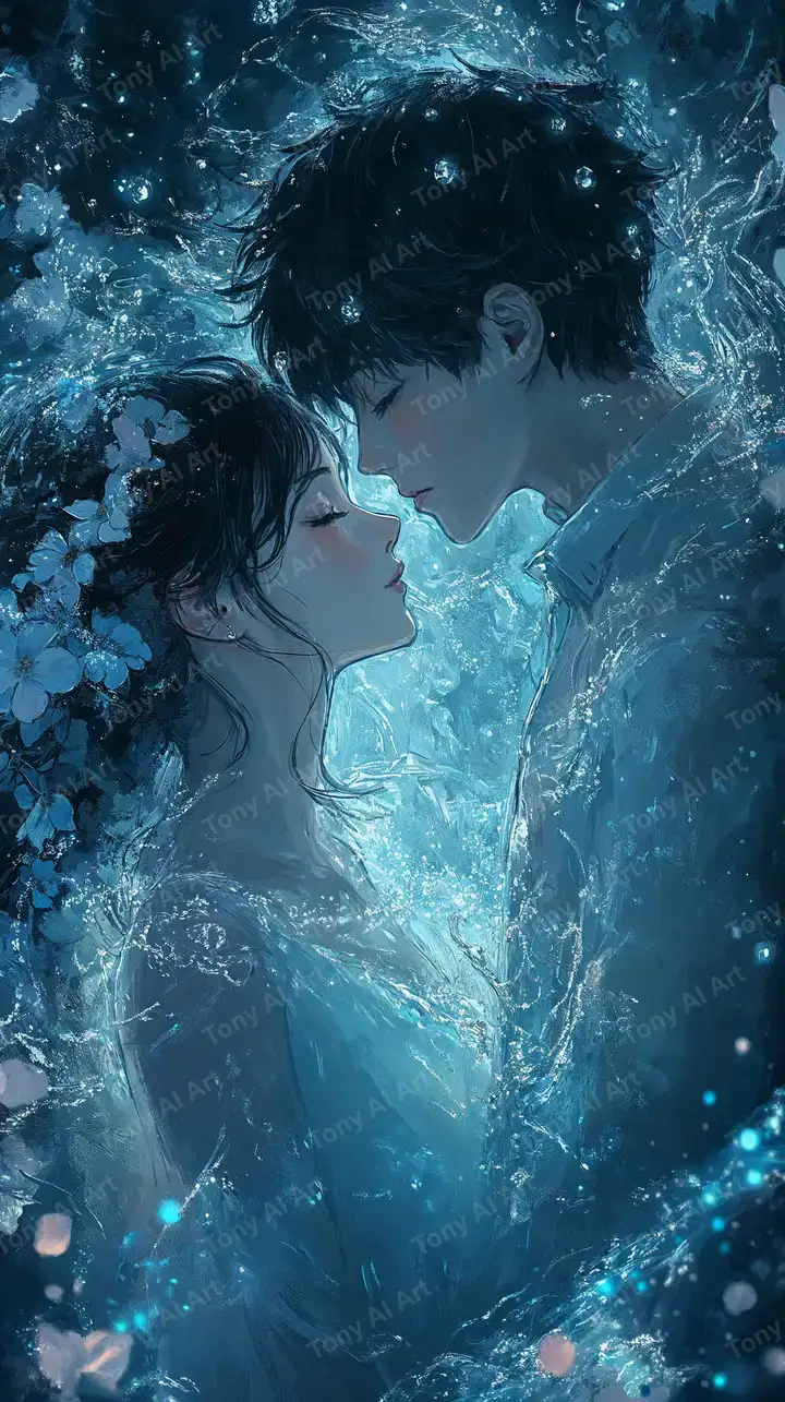 Hình nền AI art cặp đôi trong hiệu ứng nước phát sáng neon xanh dương, phong cách digital ethereal, tải miễn phí 4K chất lượng cao.