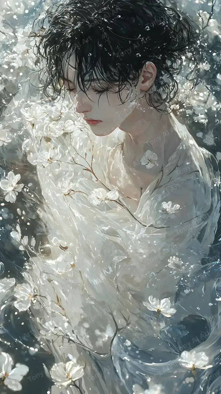 Hình nền AI art cô gái tóc đen xoăn giữa vườn hoa trắng, hiệu ứng neon glow ethereal, tải miễn phí 4K.
