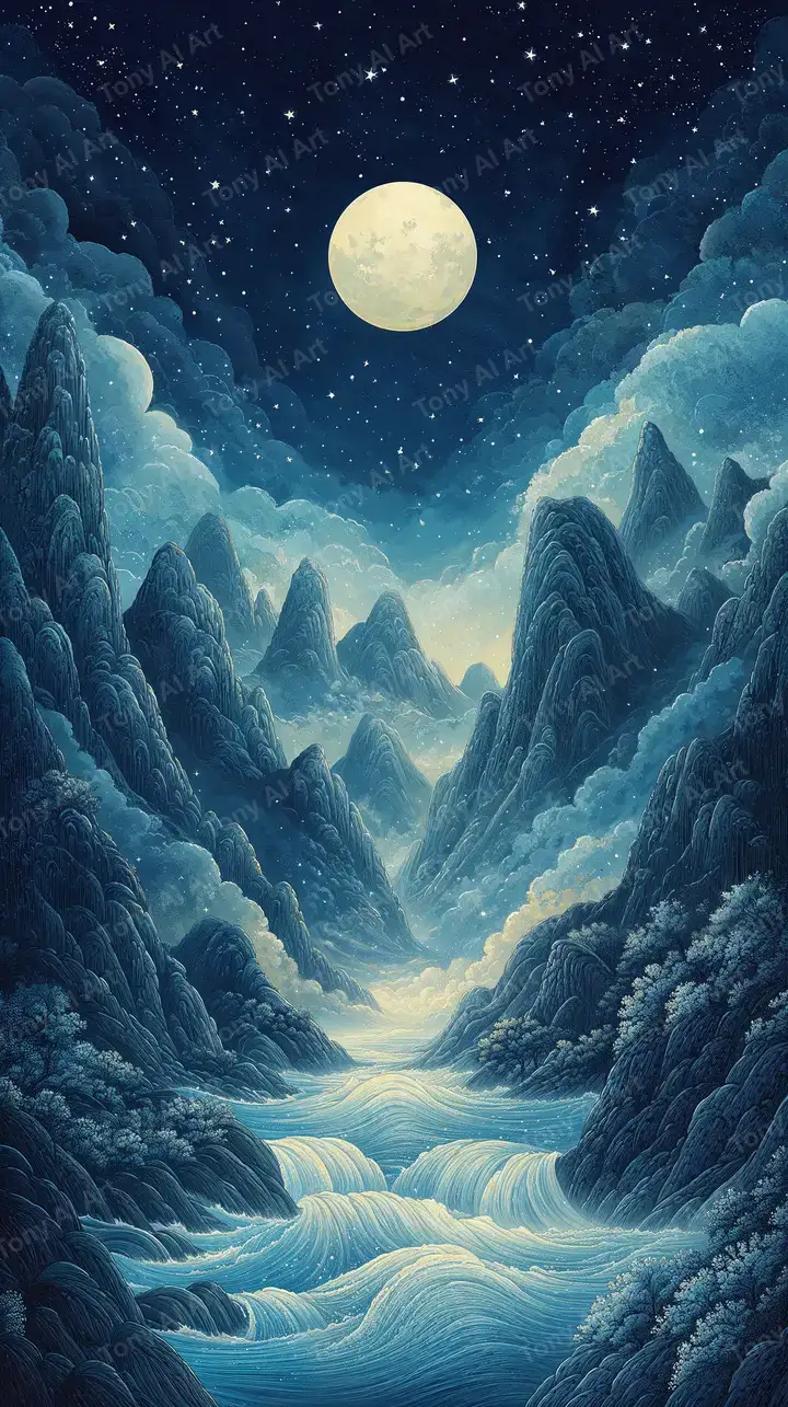 Hình nền tranh phong cảnh núi nước Á Đông, trăng sáng với sương mù, bình yên thiền định. Tải miễn phí 4K.