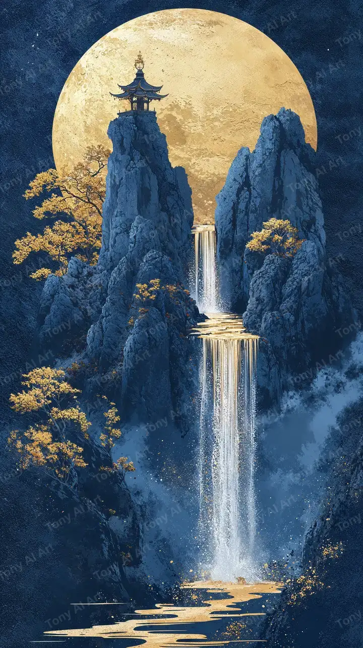 Hình nền AI art thác nước núi đá pagoda trăng vàng phong thủy, hiệu ứng glow ethereal, tải miễn phí 4K.