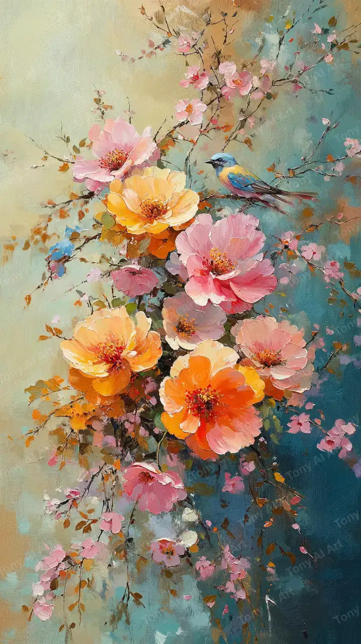 Hình nền hoa AI art phong cách watercolor, hoa hồng cam trên nền xanh dương, chim nhỏ lãng mạn, hiệu ứng soft blur, tải miễn phí 4K.