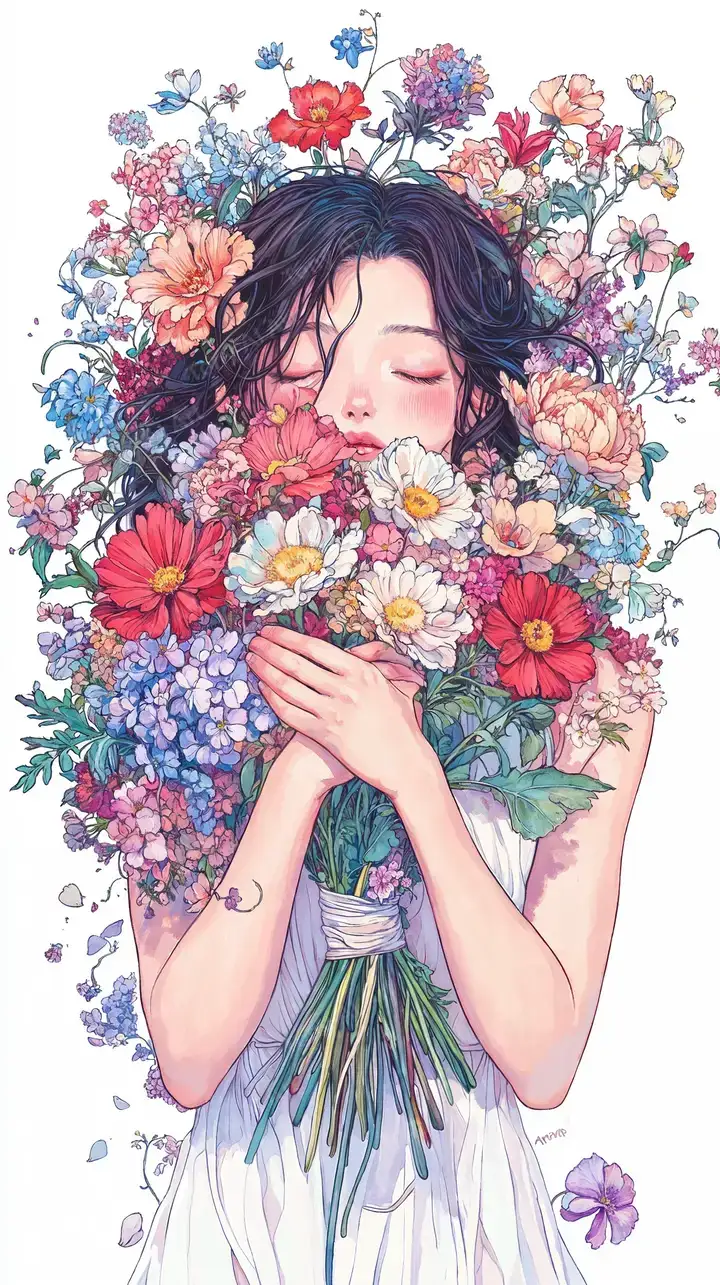 Hình nền AI art cô gái với bó hoa lá rực rỡ, hiệu ứng watercolor dreamy, tải 4K miễn phí cho máy tính.