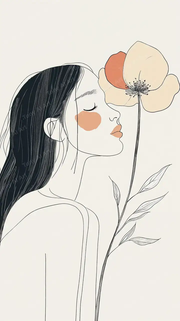 Hình nền line art minimalist phụ nữ ngửi hoa poppy cam, phong cách botanical AI art, nền trắng thanh lịch, tải 4K miễn phí.