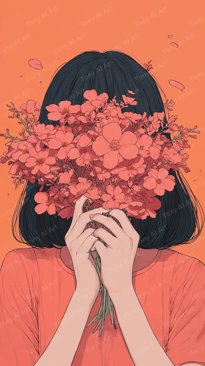 Hình nền chân dung nữ với hoa hồng cam tươi sáng, phong cách minimalist surreal, tải miễn phí 4K.