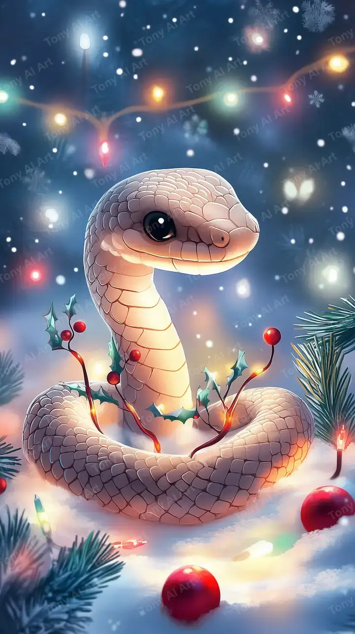 Hình nền rắn trắng chibi kỳ ảo với hiệu ứng neon glow cosmic, cảnh đêm sao, AI art dreamy 4K tải miễn phí.