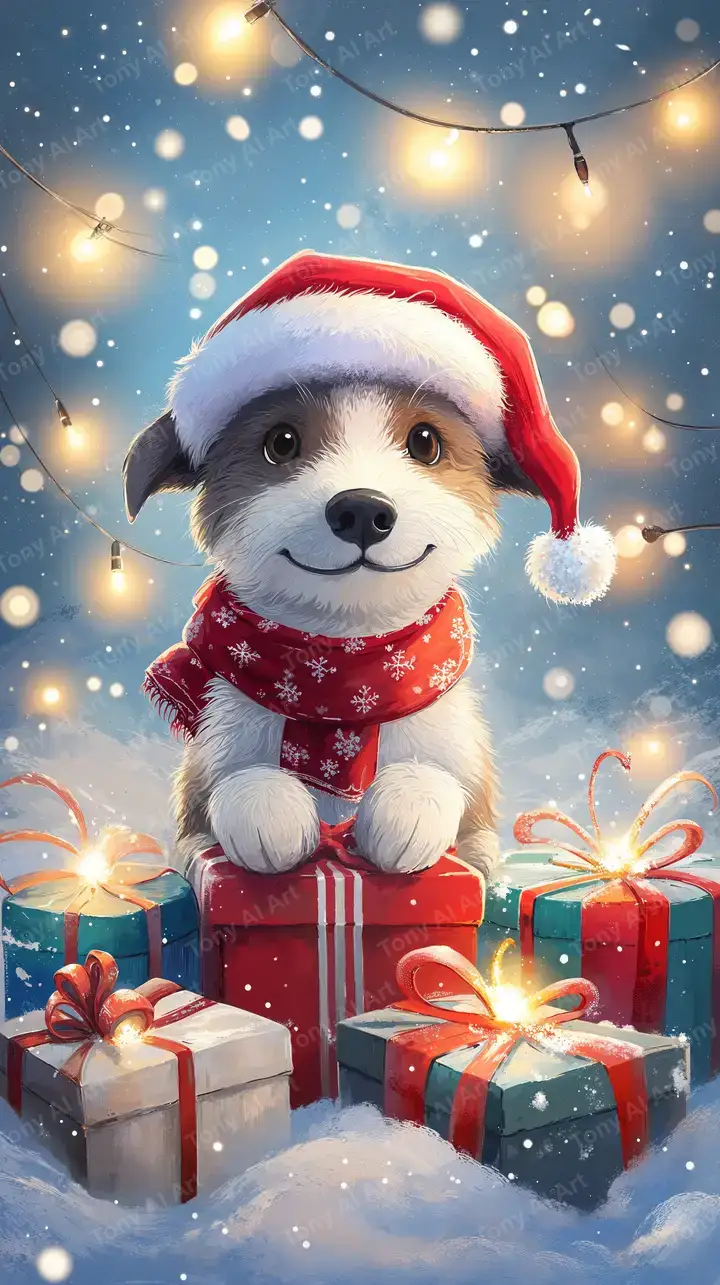 Hình nền chó Giáng sinh mũ Santa đỏ, hiệu ứng bokeh sáng ấm, quà tặng, tuyết 4K AI art tải miễn phí.