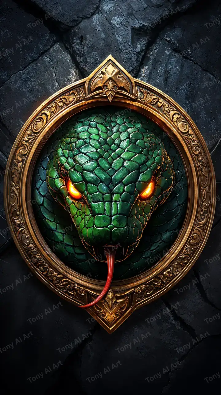 Hình nền rắn xanh mắt neon vàng, khung baroque tinh xảo, phong cách thần bí AI art, tải miễn phí 4K.