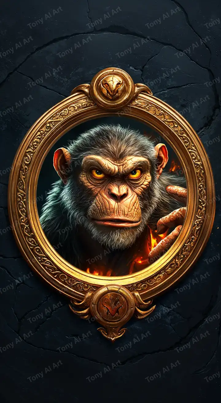Hình nền khỉ vàng baroque phong thủy AI art, khung ornate cổ điển, hiệu ứng glow luminous, nền đá tối bí ẩn, tải miễn phí 4K.