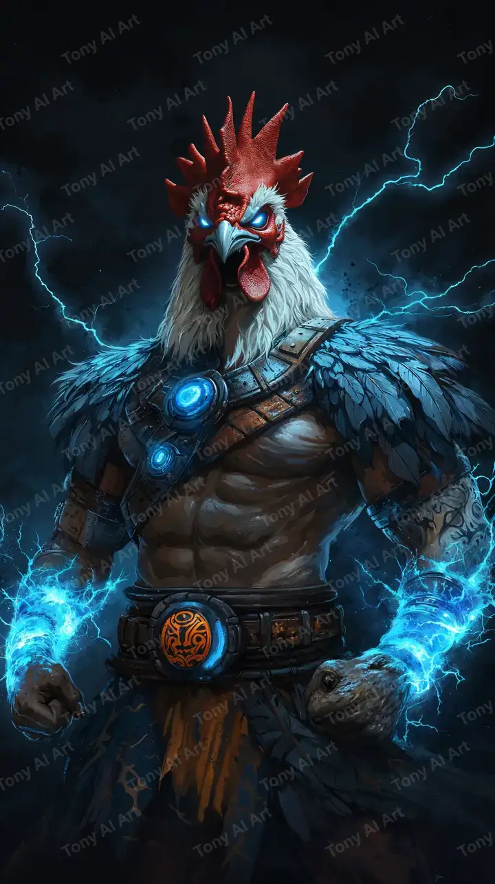 Hình nền gà cyborg neon siêu anh hùng với hiệu ứng sét xanh điện, phong cách cyberpunk đầy sức mạnh, tải miễn phí 4K.