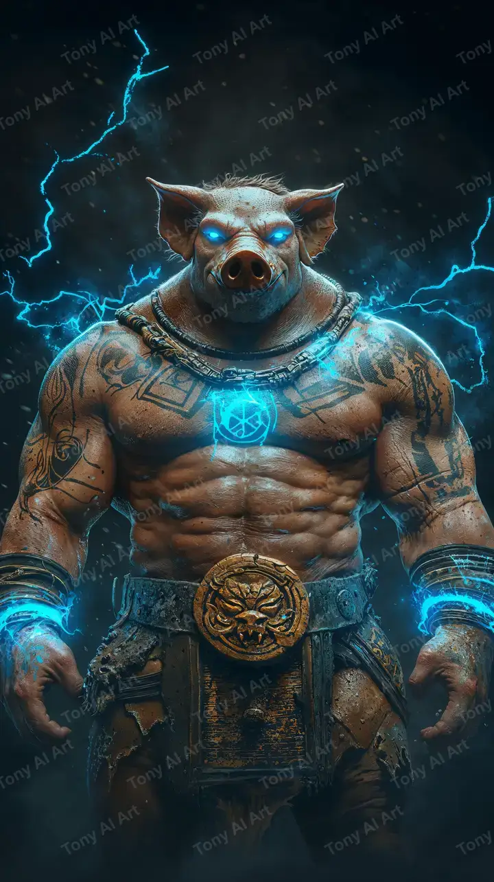 Hình nền chiến binh lợn cyberpunk với hiệu ứng neon xanh điện, phong thủy bí ẩn, tải miễn phí 4K.