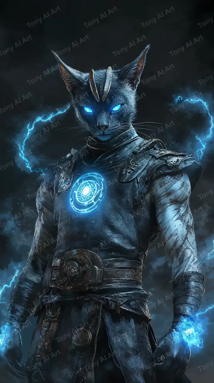 300 DPIMèo Chiến Binh Điện Xanh - Hình Nền AI Art Huyền Bí 4K