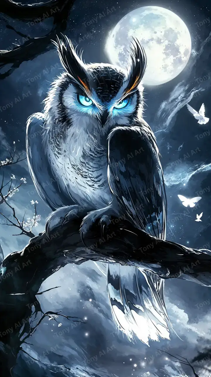 Hình nền cú mèo neon xanh lạnh, mặt trăng sáng, hiệu ứng cosmic AI art, tải miễn phí 4K.
