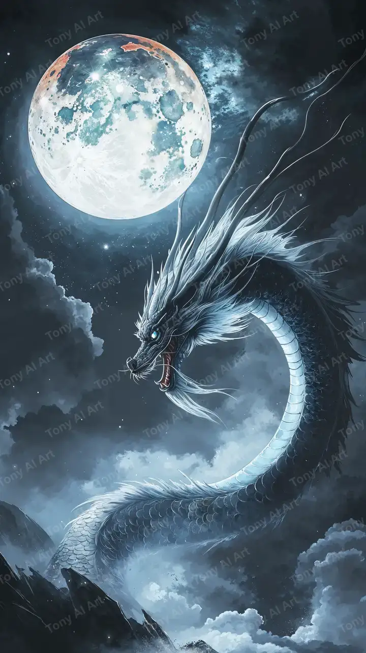Hình nền rồng cosmic phong thủy AI art với hiệu ứng neon xanh, ánh trăng, tải miễn phí 4K HD.