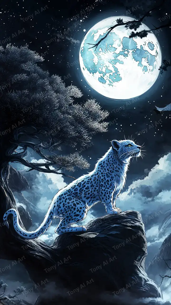 Hình nền báo xanh neon phong cảnh trăng tròn, hiệu ứng cosmic glow, AI art tuyệt đẹp, tải miễn phí 4K.