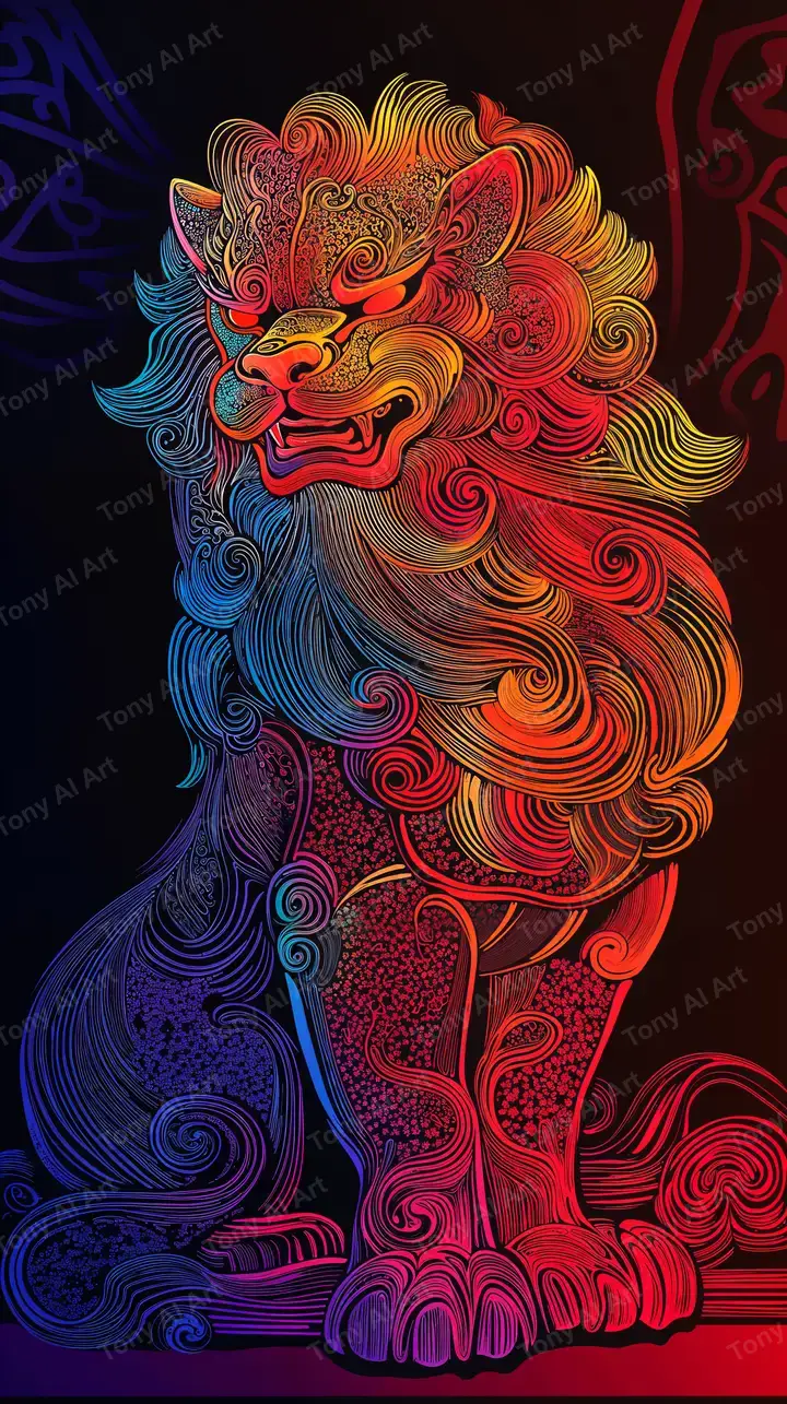 Hình nền sư tử phong thủy hiệu ứng neon gradient, ai art 4K độc đáo, tải miễn phí, chi tiết tỉ mỉ, nền tối minimalist.
