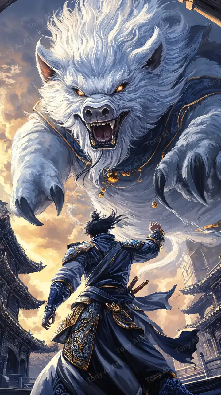 Hình nền AI art samurai đối mặt quái vật trắng với hiệu ứng cosmic glow và ánh sáng kịch tích, tải miễn phí 4K.