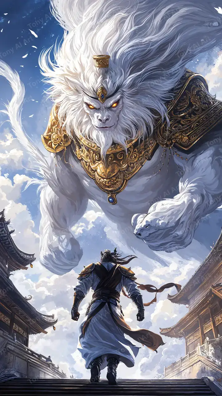 Hình nền rồng thần AI art phong thủy, nhân vật celestial với trang sức vàng kim, kiến trúc đền cổ, hiệu ứng ánh sáng lung linh, tải 4K miễn phí.