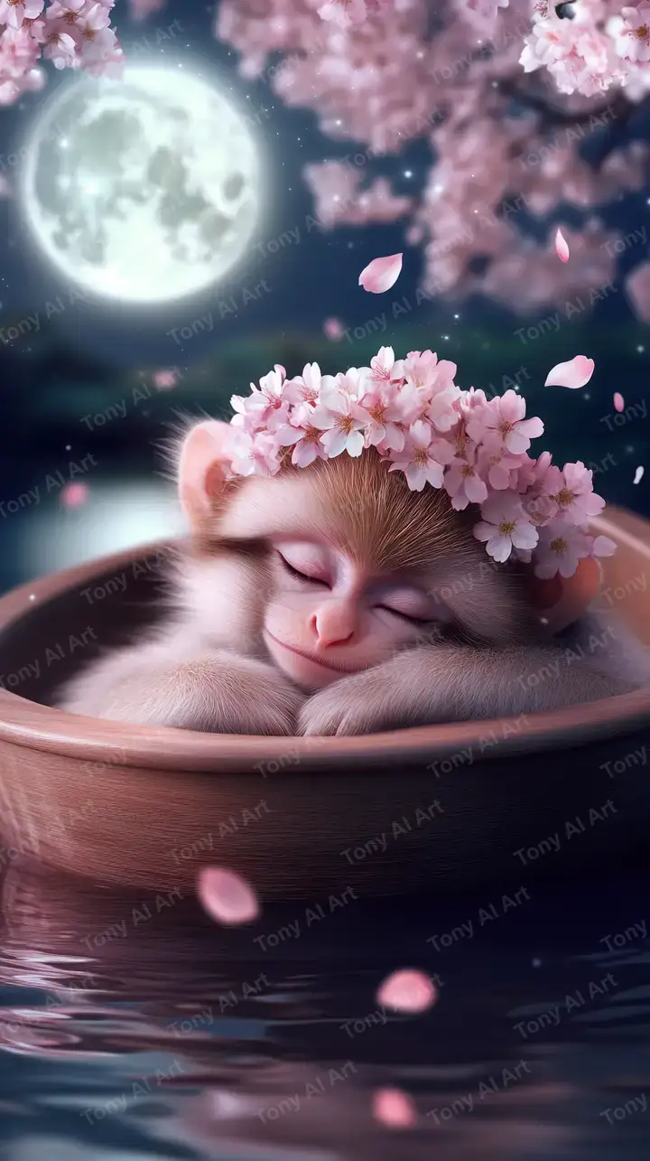 Hình nền AI art khỉ ngủ dưới trăng sáng, hoa anh đào hồng bay rơi, hiệu ứng neon mềm cosmic, tải miễn phí 4K.