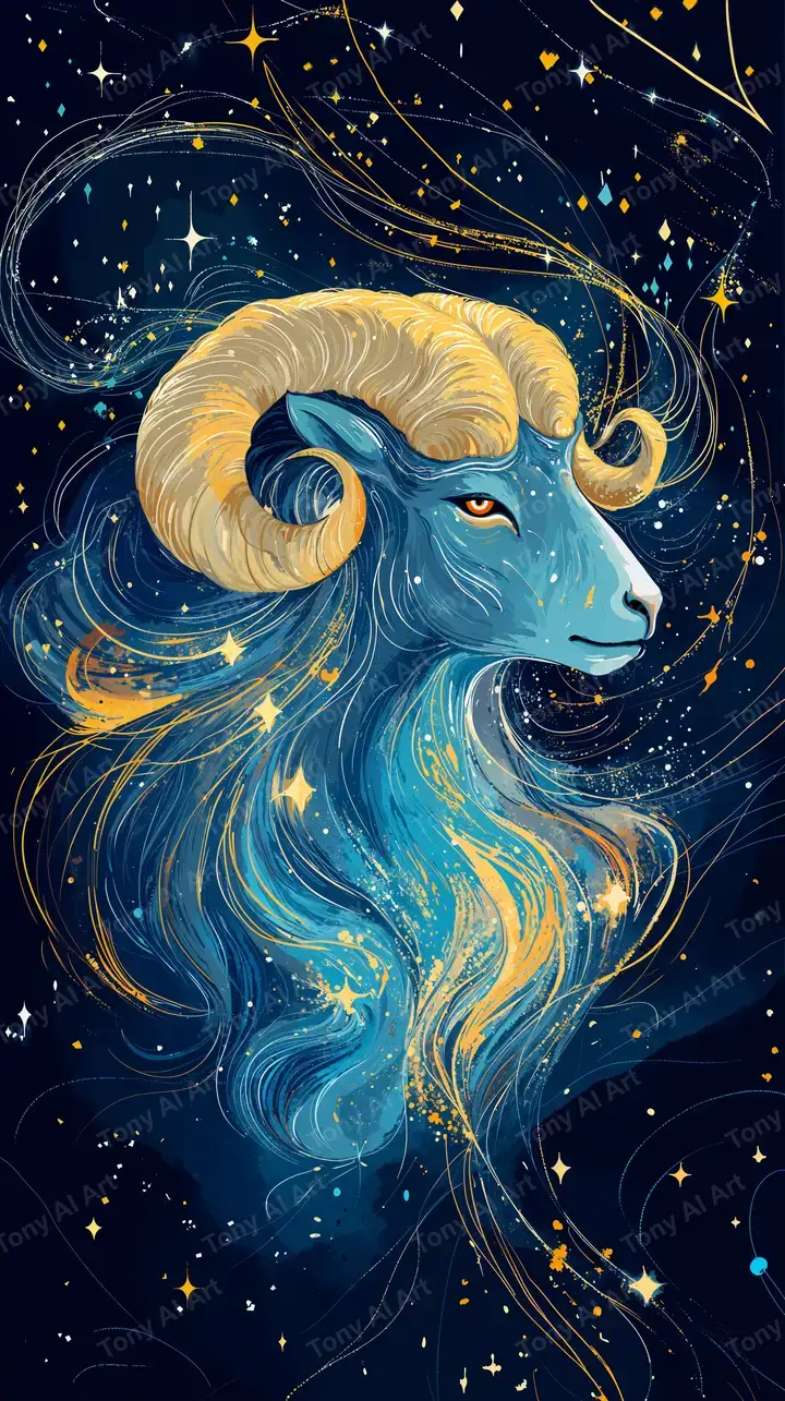 Hình nền dê capricorn vũ trụ AI art với hiệu ứng neon vàng xanh, bầu trời sao lấp lánh, tải miễn phí 4K.