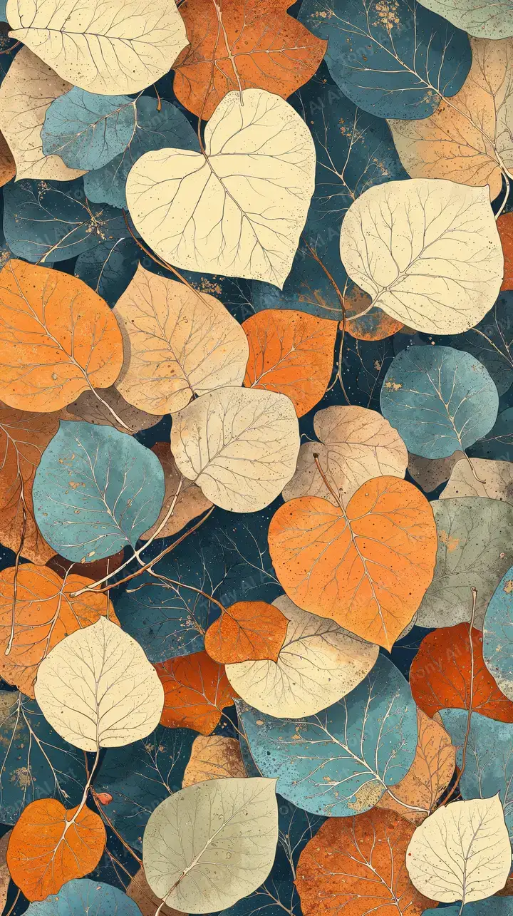 Hình nền lá cây botanical AI art với sắc cam-teal vintage, texture hiện đại, tải miễn phí 4K HD cho desktop & mobile.