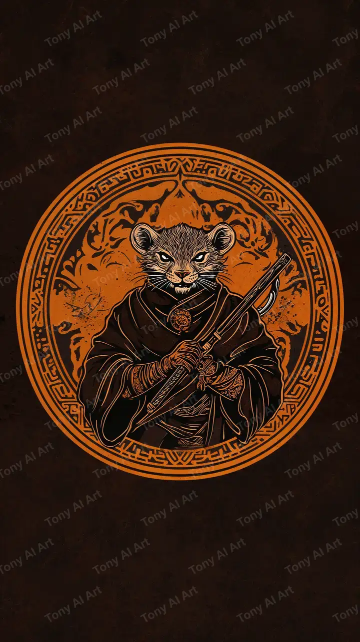 Hình nền chuột samurai phong thủy AI art tâm linh, hiệu ứng mandala cam vàng neon, con Tý mạnh mẽ, tải miễn phí 4K.
